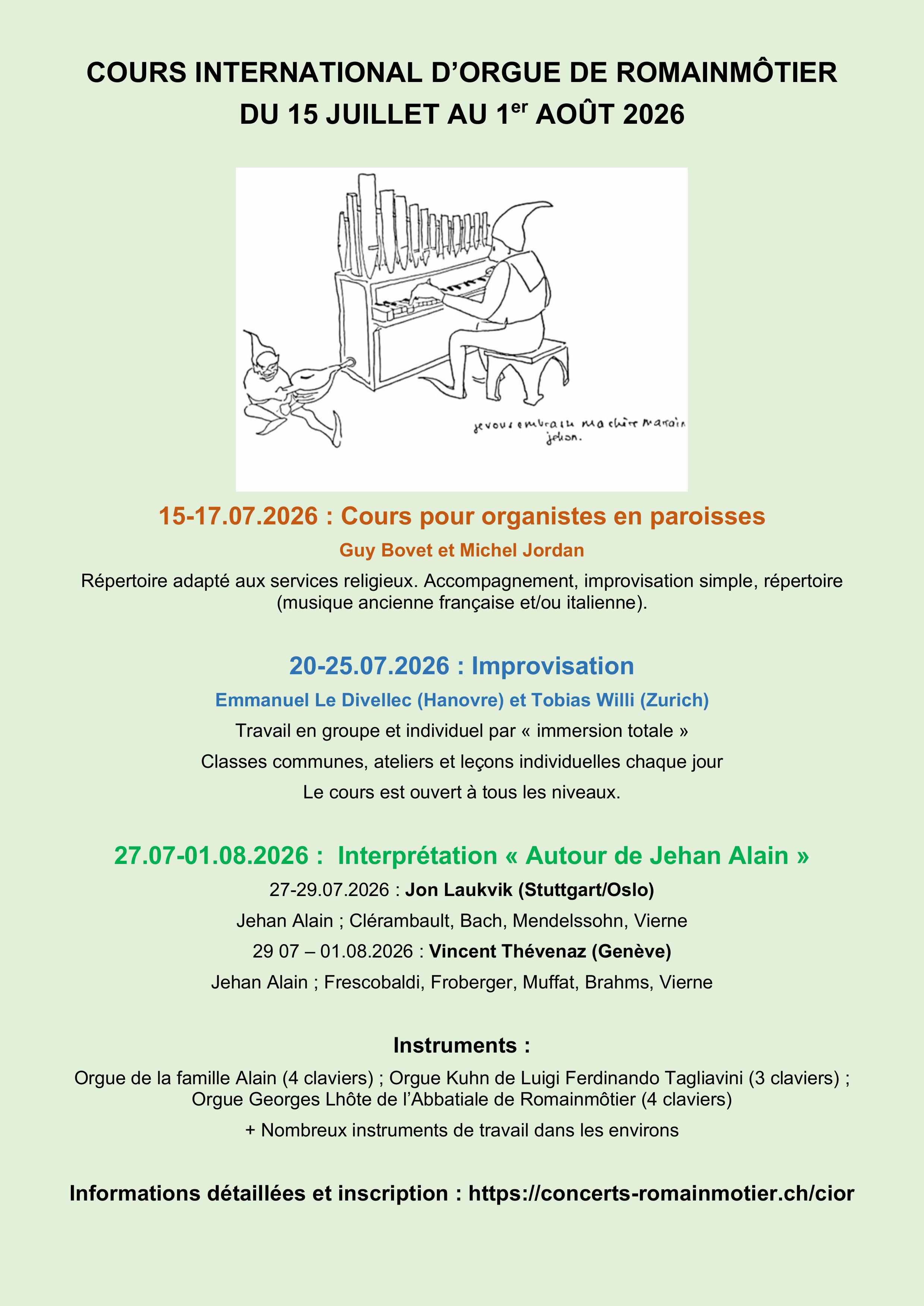 Unter https://jehanalain.ch/courses/?lang=de finden Sie detaillierte Informationen, das Anmeldeformular und die aktuellen Repertoire-Listen für 2024 zu den entsprechenden Kursen. Anmeldungen sind ab dem 01.12. 2023 möglich. Wir freuen uns auf eure Anmeldung!